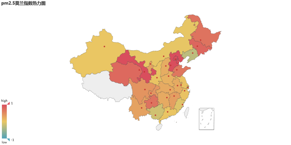 计算省的pm2.5平均值作为观测矩阵,省会的距离的倒数作为空间权重矩阵,计算全局莫兰指数为0.49,显著性检验p值为3.75>1.96,得出中国地区的pm2.5存在空间正相关