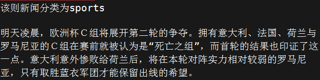 将9类新闻语料切割为训练集和数据集,对新闻进行分词、去停用词、句向量构建后,调用sklearn模块提供的朴素贝叶斯接口建模,对新闻分类