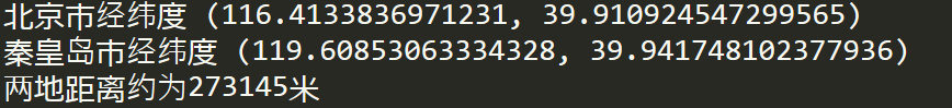 程序封装了两个接口,一是调用百度地图的API来获得地点的经纬度,二是调用python的geopy模块来计算两个经纬度的直线距离