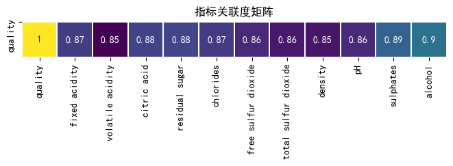 对红酒质量指标数据进行灰色关联分析,首先进行数据标准化,然后计算关联系数矩阵和平均综合关联度